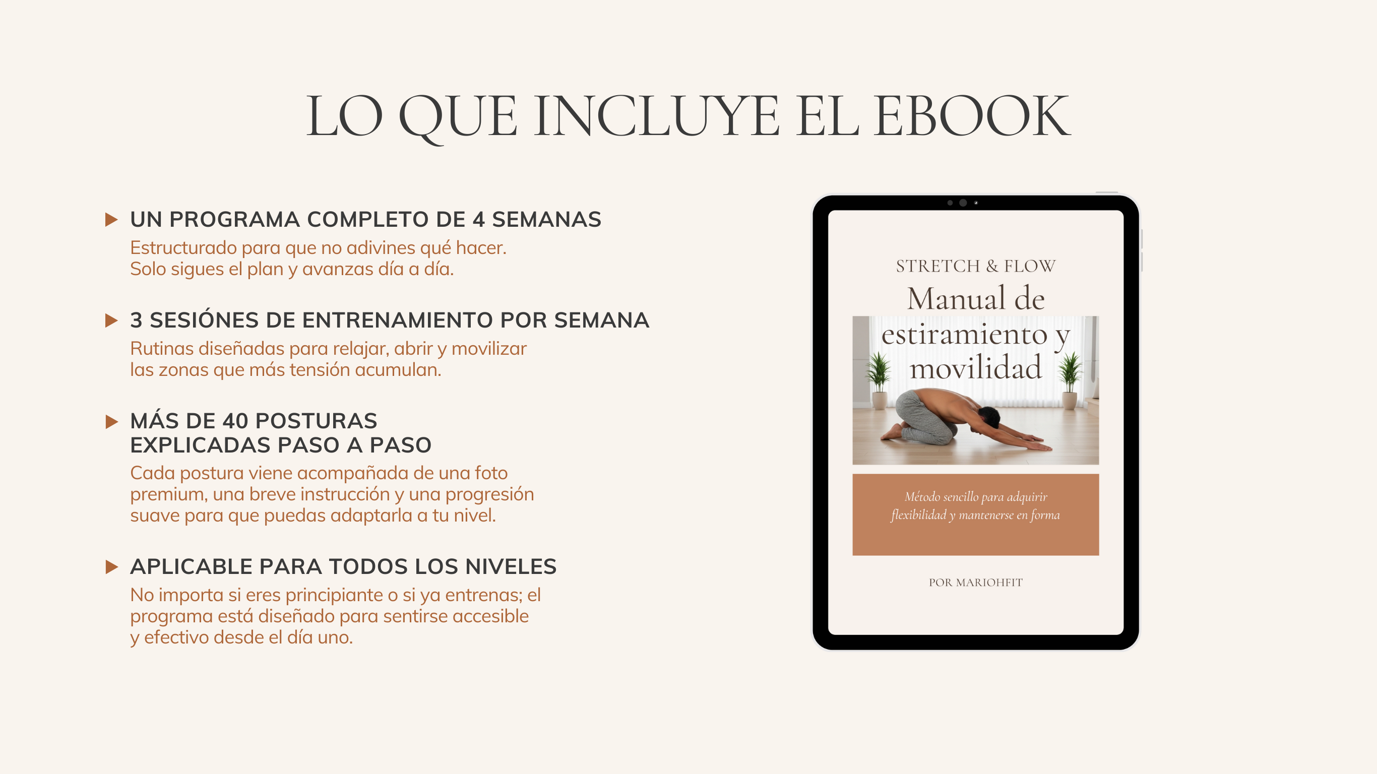 El ebook es una guía estructurada de movilidad con un camino claro de 4 semanas.